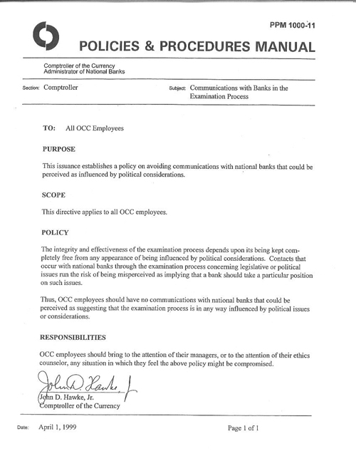 Gramm informed the OCC of his concerns about the political use of the examination process in late January. Comptroller of the Currency John D. Hawke Jr. responded with a Feb. 5 memorandum to OCC staff, directing an end to "improper" contacts with bank officers and employees. The new ethics rule formalizes Hawke's directive.